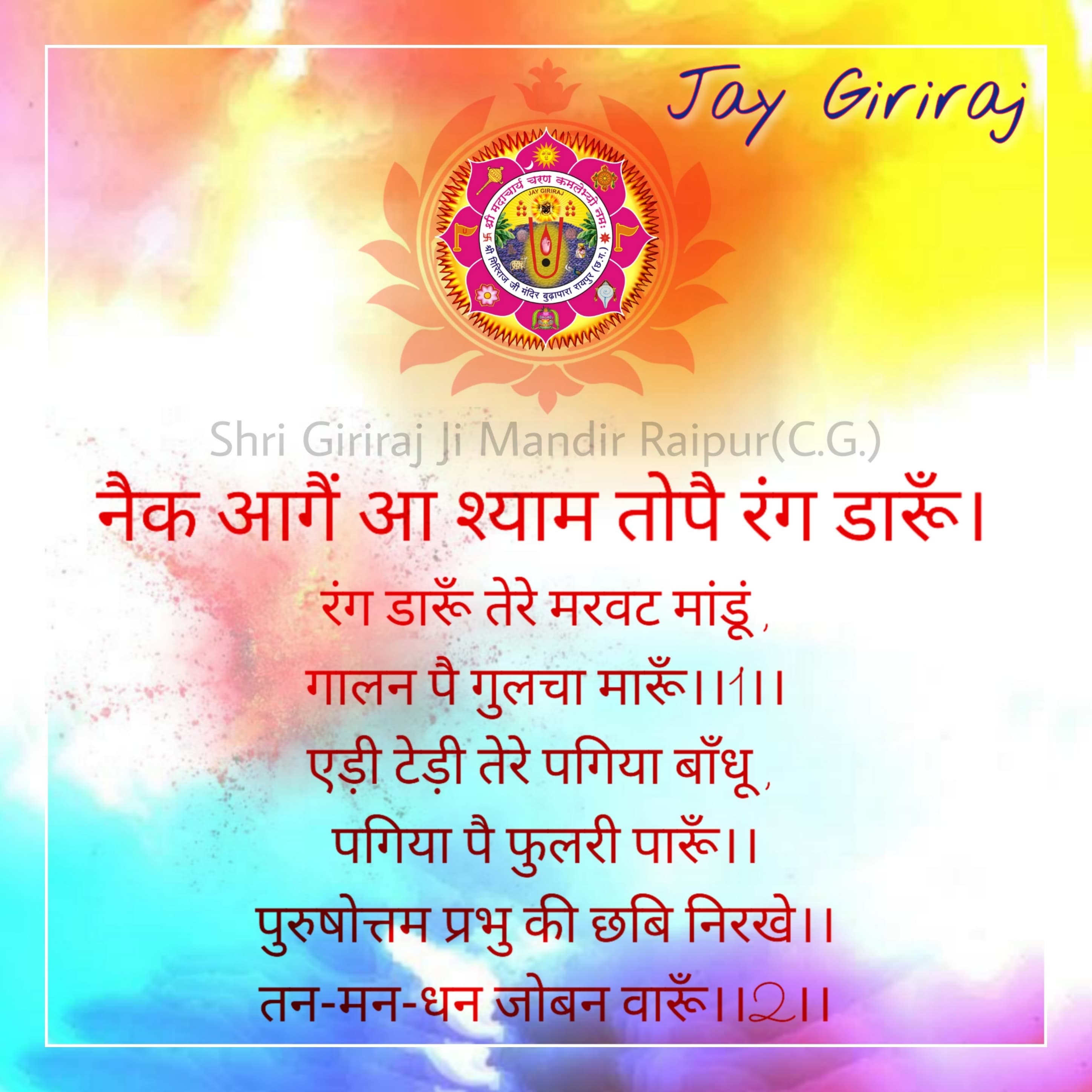 18/02/2026, बुधवार,श्री गिरिराज जी पे होली खेल की भावना का मनोरथ, संध्या आरती में मनोरथ 6:30 बजे 22/02/2026, रविवार ,संध्या समय फूलफाग का मनोरथ 7:00 बजे 23/02/2026, सोमवार, श्री त्रिभंगीराय जी का पाटोत्सव राजभोग में भारी खेल 11:30 बजे के आसपास
