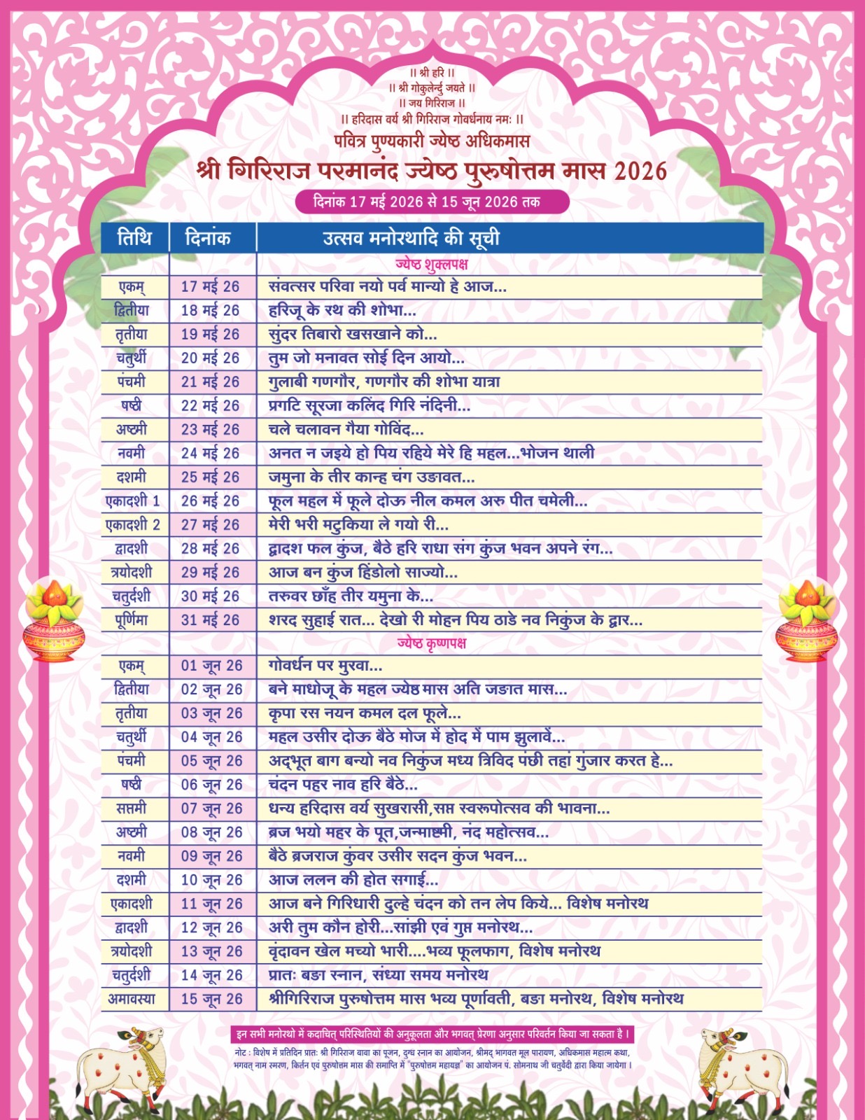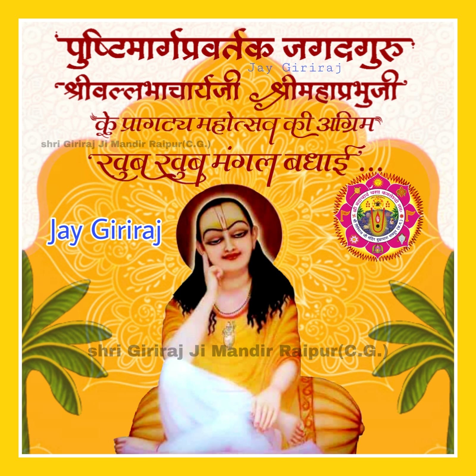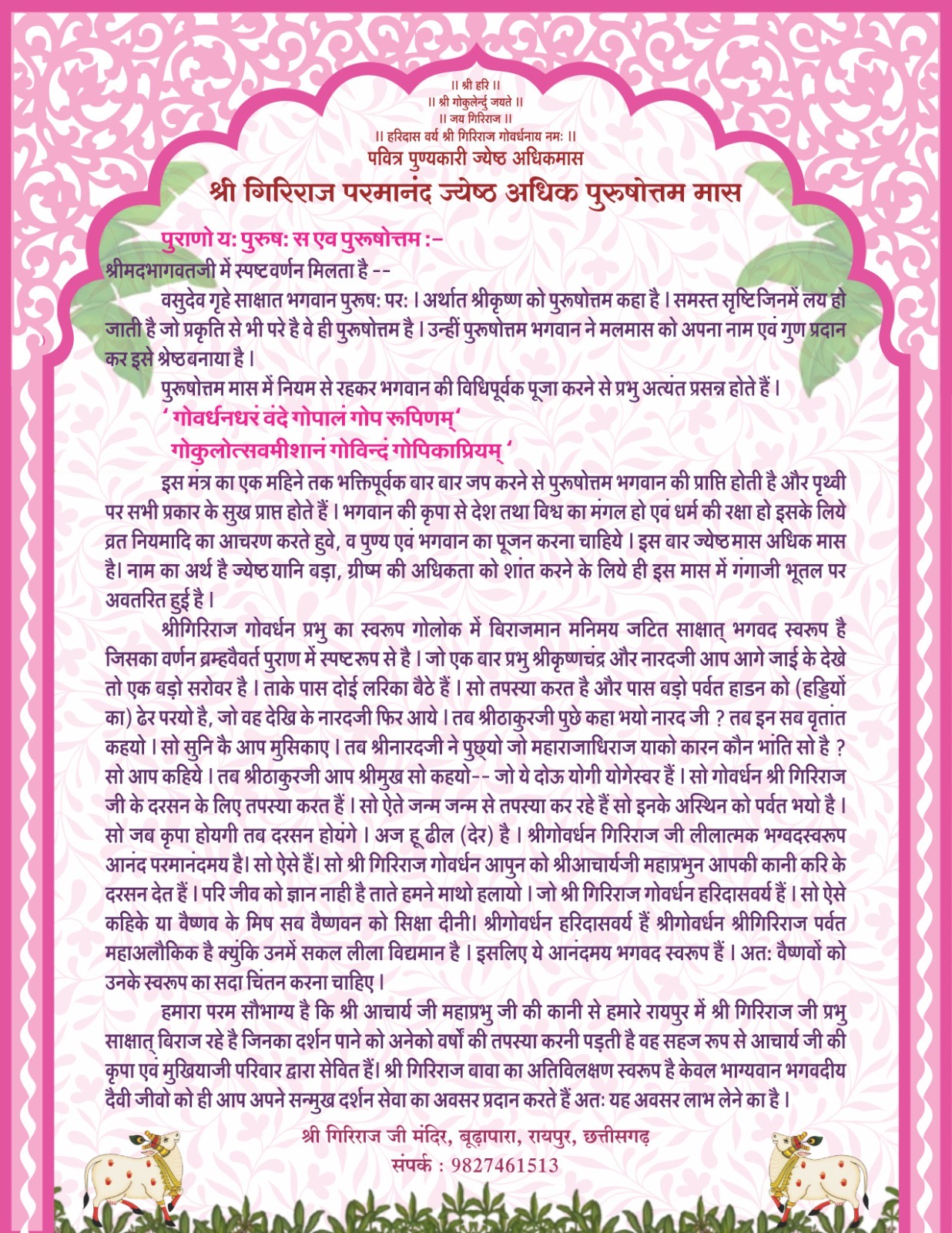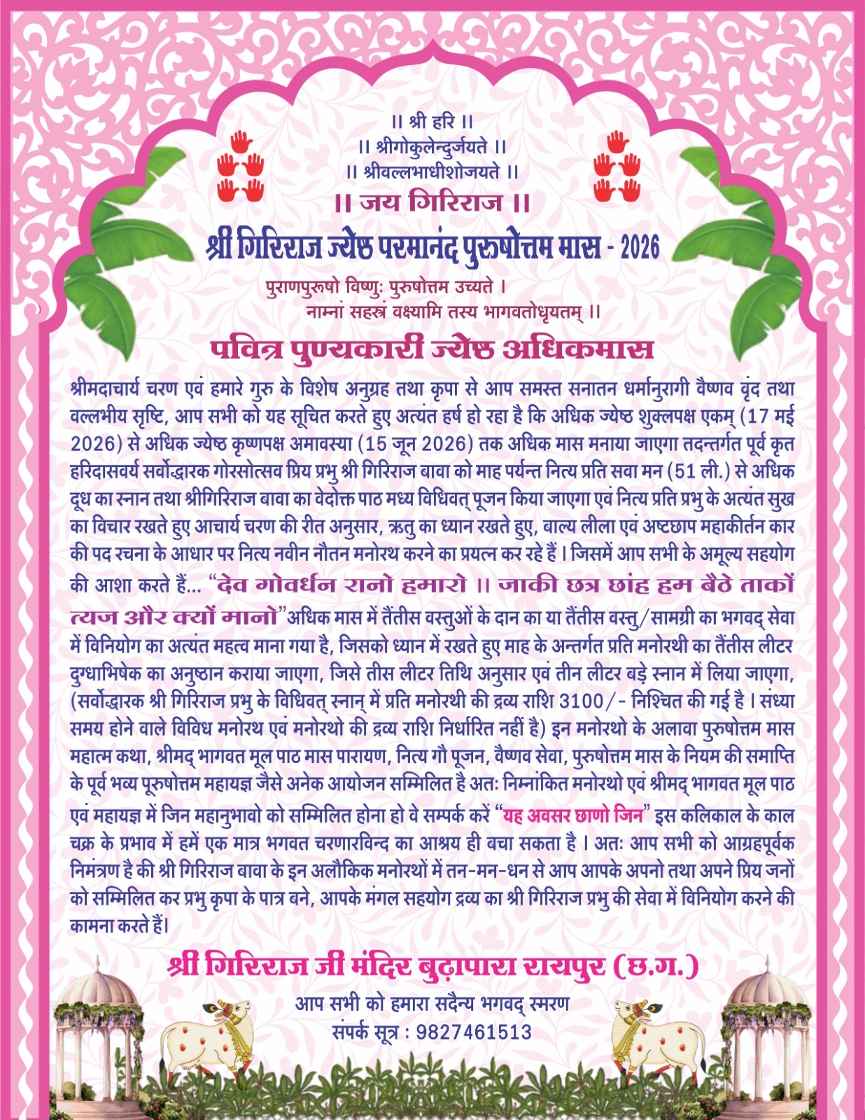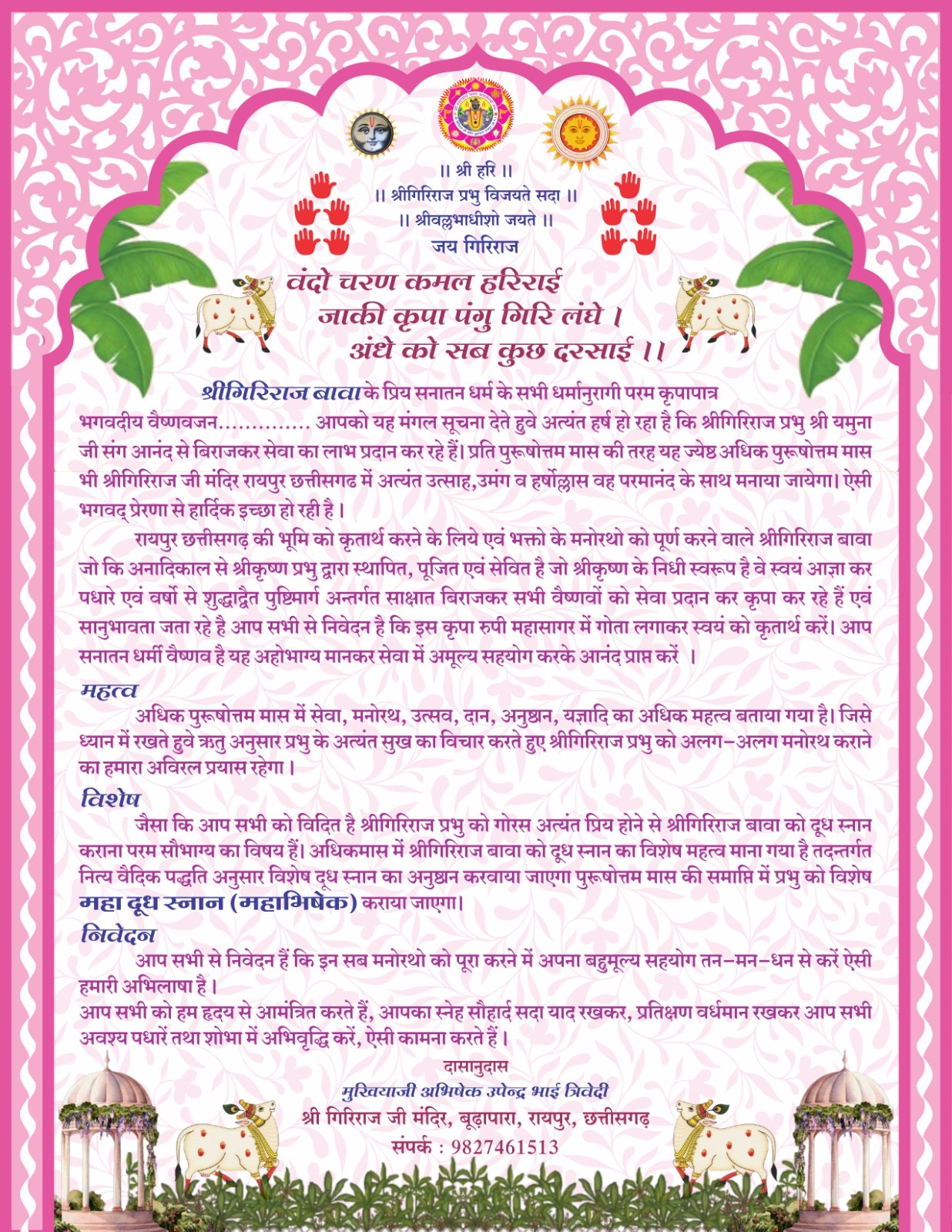 श्रीमद् आचार्य चरण की कृपा से सर्वोद्धारक श्रीगिरिराज प्रभु जो कि हमारे माथे बिराजकर रायपुर नगर के तथा आपके सभी देश/विदेश के निज भक्तों को अपनी परम कृपा से परमानुग्रहित कर अपने सभी निज भक्तों को भक्ति रस का दान करते हुए दर्शन एवं सेवा का मंगल लाभ प्रदान कर रहें हैं।तथाश्च समस्त पुष्टि वल्लभीय वैष्णव एवं चतुश संप्रदाय अंतर्गत समस्त सनातन धर्मानुरागी वैष्णव जनो की प्रत्यक्ष/अप्रत्यक्ष रूप से सेवा अंगीकार कर सभी भक्तों को कृतार्थ कर रहें हैं।