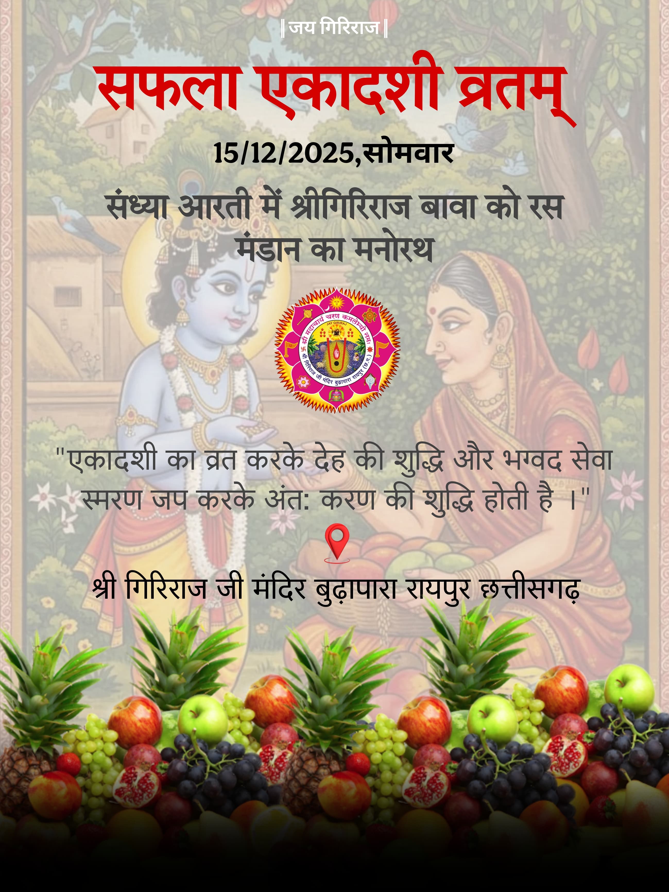 18/02/2026, बुधवार,श्री गिरिराज जी पे होली खेल की भावना का मनोरथ, संध्या आरती में मनोरथ 6:30 बजे 22/02/2026, रविवार ,संध्या समय फूलफाग का मनोरथ 7:00 बजे 23/02/2026, सोमवार, श्री त्रिभंगीराय जी का पाटोत्सव राजभोग में भारी खेल 11:30 बजे के आसपास